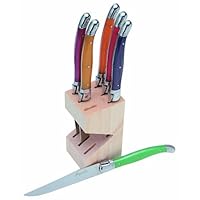 Jean Dubost 6 Steak Knives in Wood Block, Multicolor