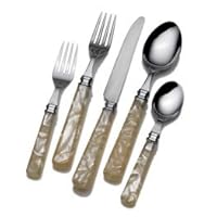 I looked all over the web for a set of Mother of Perl flatware. While I could find a few pieces of antique (Real) Mother of Perl; it was both expensive and not full sets. I was looking for another set as mine had been ruined by water damage (Flooding). The quality of this set most closely resembled the beautiful set I had owned for years. While they are not real Mother of Pearl; they are substantial weight and very pretty. I ordered two sets and I am happy with the purchase and the price.The honey/ivory colored handles are exactly what I had hoped for, in addition to the swirled pattern, giving the flatware some character!