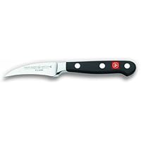 This is a "tourne" knife with a "carving" blade that curves inwardly. It is designed to be used when you're holding an object in one hand and cutting with the other. It is not really designed to be used with the edge downward, as when cutting against a cutting cutting board. Hence, some see it as a "peeling" knife, which it is, but it is also useful for carving vegetables, removing the stems from strawberries or for stemming and seeding greenpeppers and other peppers where you want to deftly remove both the seeds and veins. It is called a "tourne" knife because it is narrow at the tip and "turns" well in any material that you want to cut with a turning motion. It is the knife of choice if you like to cut things and let the pieces fall directly into the pot or bowl, as your grandmother did. Because the blade turns easily, it removes meat easily from bones, in tight places such as near the complex bones in lamb legs or ham shanks. In any case, the blade turns easily in tight spaces. If you want to make "boat shaped" French potatoes or carrots, this is the knife of choice. And yes, if you like to eat cheese or something else cutable in your favorite easy chair, watching television, it is unmatched, although your family will object when the cheese is returned to the fridge shaped like a duck decoy. When using any carving knife, the blade faces toward you, rather than away from you. The handle is held with four fingers, and cutting force is applied in opposition to the thumb, forcing the object being cut towards the blade. This knife is habit-forming. It fits the hand nicely and tends to get used to cut all sorts of things it wasn't designed for, so after awhile. It is a specialized paring knife, but does not replace an ordinary paring knife. The Wusthof "Classic" handle is flat on two sides, making it ideal (laid flat on a cutting board) for cutting a "pocket" for stuffing veal or chicken breasts. The classic handle gives better blade control than the new "ergonomic" handles, even Wusthof's other models. Because the "classic" handle has the feel of two flat sides for reference, you always instinctively know where the blade is, which is not the case with many of the newer, rounded, ergonomic handles. This is also the knife of choice for cutting the tape and opening boxes from Amazon . . .Want Wusthof Classic 2-3/4-Inch Peeling Knife Discount?