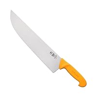 I bought the 14" knife with no particular use in mind. It is much lighter than I expected, and surprisingly well balanced. The stout handle is attached solidly, molded on, not riveted. It's doesn't seem to be a good fit for someone with small hands.The fit and finish are just superb, and the polish on the blade makes it look like a work of art. The handle color is not "bright yellow" though, it is safety orange. No way it is getting lost in a kitchen or outside cutting up game. This is a slicing knife, I suspect it's too light to be useful for hacking through a bone or opening a coconut. But those are jobs for a cleaver, not a knife, anyway.