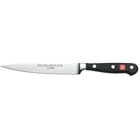 My most used knife in the kitchen in my Wusthof 4" paring knife. The next most used knife is my Wusthof 6 3/8" Sandwich knife. This knife stays incredably sharp. It's blade is thinner than most other knives in its size, including the Henkle. The blade taper starts almost from the very edge. These two factors helps it slice through what you are cutting easier that thicker knives. I have found the blade thickness to be a very big factor when cutting. I have Henkle knives also, but they do not hold their edge anywhere as long as my Wuthof knives. My teenage kids refer to this Wusthof knife as the "death knife" because it is always so sharp, and scarry to them. I use it for cutting bread (works better than a serrated knife), vegtables, mellons, and carving meats. The only use I have for my 8" knife is lettuce and carving turkeys. I get much more use out of this 6" knife. I never use my knives as a screew driver or to pry anything, so the thinness is not a problem. Wusthof knives last a life time and are worth every cent you pay for them.Want Wusthof Classic 6-Inch Sandwich Knife Discount?