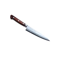 Spending almost a month doing research on Amazon's wide selection of kitchen cutlery, I'm so glad I ignored the previous 3 star review on this knife and bought it on a hunch. I think this is AWESOME value for such a great knife. Out of the box, it showed no mercy prepping onions, garlic cloves, mushrooms, carrots and celery with buttery precision. Also, I really love the taper design of these Asian petty knives as it allows me to speed up at the tip for smaller veggies. I think this knife actually looks better in person than the picture as the blade's almost chrome-like finish mingled with the damascus swirls is a testament to the fine finishing craftsmanship of the blade. If you need a small prep knife, THIS IS IT! Wanted to buy a real Japanese kitchen knife. Really glad that I bought this one from Yoshihiro Cutlery. The craftsman ship and beauity is stunning. The wood handle on the full tang that extends from the hammered damascus blade, has so much depth that no photo can show the full detail. As for cutting, the blade is the smoothest and sharpest that I've ever used. Service was the best, shipped, solidly packed-so arrived in perfect condition. My score is a 5+ as every aspect of this transaction was flawless.Buy Yoshihiro Cutlery Hammered Damascus Petty Chef Knife, 5-Inch Now