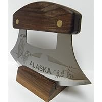 Buy Alaskan Inupiat Style Walnut Ulu Knife with "Puffin Sunset" Etched Blade & Display Stand Now