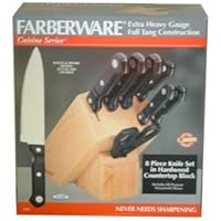 I have a set of these Farberware knives and I'll never buy this brand again. Within two weeks of buying these knives there was rust forming on the steel shank inside the handle and had spread to the base of the knives at the handle. It's not like I leave my knives soaking in water for days on end. I wash them in the manner most cooks do and then place them tip down in the drainer to dry. And still they rusted. And it isn't just these knives that I have this problem with. I also had a Farberware 8" non-stick frying pan that had rusted to complete uselessness within a month. Never again will I buy another Farberware product.Read Best Reviews of FARBERWARE 8 Piece KNIFE SET & BLOCK Cuisine Series Here
