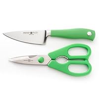 this set is awesome, if hideously colored lol. they are excellent quality blades to match the rest of the grand prix II line. I love the break apart scissors so I can clean them properly and also use a steel on them. I got the set cuz I thought a smaller knife would be better for finely mincing herbs like oregano with shorter rocking motions like the youtube videos showed me was the pro way to do (lol). however, after having learned to do that the right way, I think a larger knife might be better for me. still, it's a great knife.